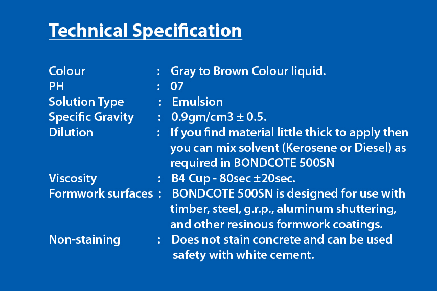 BONDCOTE 500SN is a blend of selected mineral oil and non hazardous chemicals, specially formulated to produce release properties which are superior to those of conventional BONDCOTE 500SN is supplied as liquid, ready for direct application on site. The chemically reactive components in BONDCOTE 500SN provide a water repellent interface which protects formwork and ensures an even colour and texture of the cast concrete. In addition to preventing adhesion of the cement matrix to the formwork, BONDCOTE 500SN will allow air to escape from the interface during concrete placing and vibration. This release of air minimizes surface blemishes and results in a substantial reduction in remedial costs.